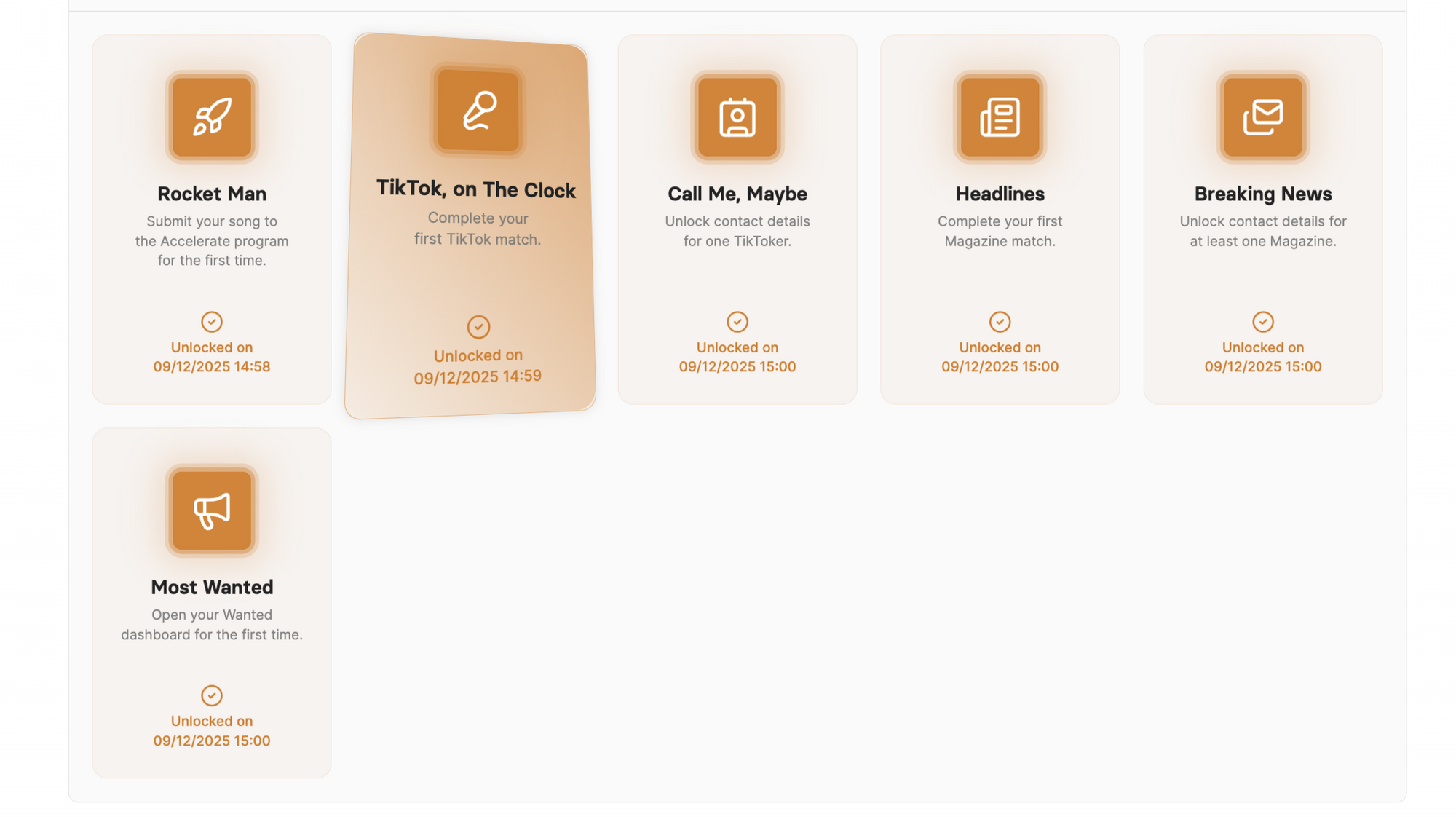Achievements are digital badges displayed in each user’s personal area. Every time an action is completed, such as submitting a track to the Accelerate program or downloading a file from the platform, a unique badge unlocks automatically.