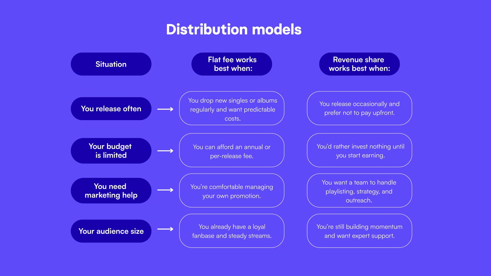 Choose flat-fee distribution if you’re confident in your promotion strategy, release consistently, and want to keep full royalty control.