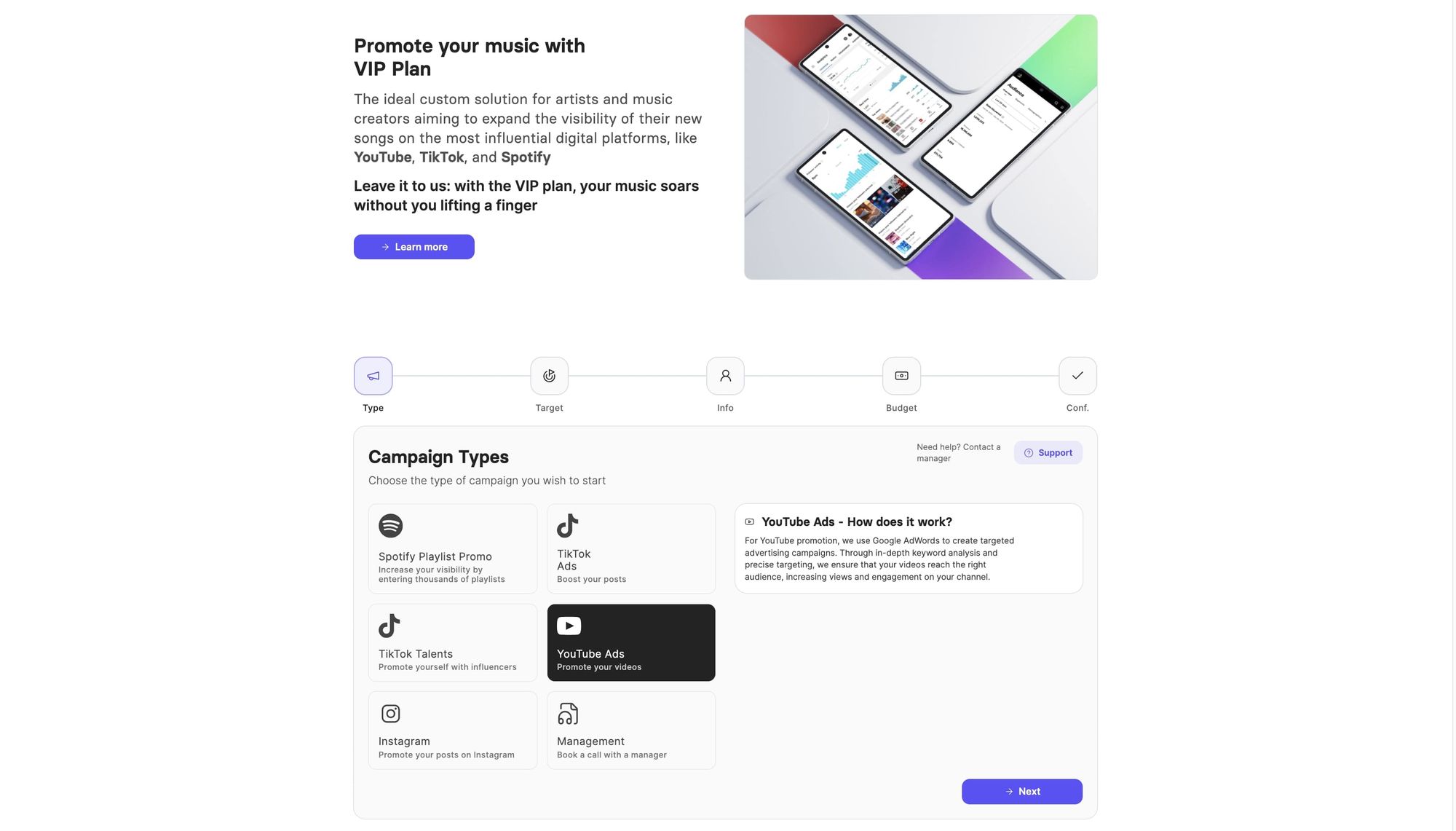 VIP Promotion on Matchfy is the perfect personalized solution for artists and music creators aiming to expand the visibility of their new songs on the most influential digital platforms, such as YouTube, TikTok, and Spotify, all in one place!